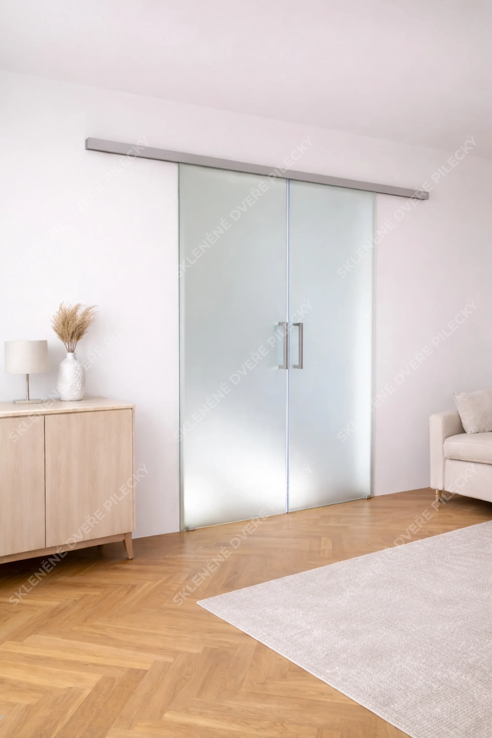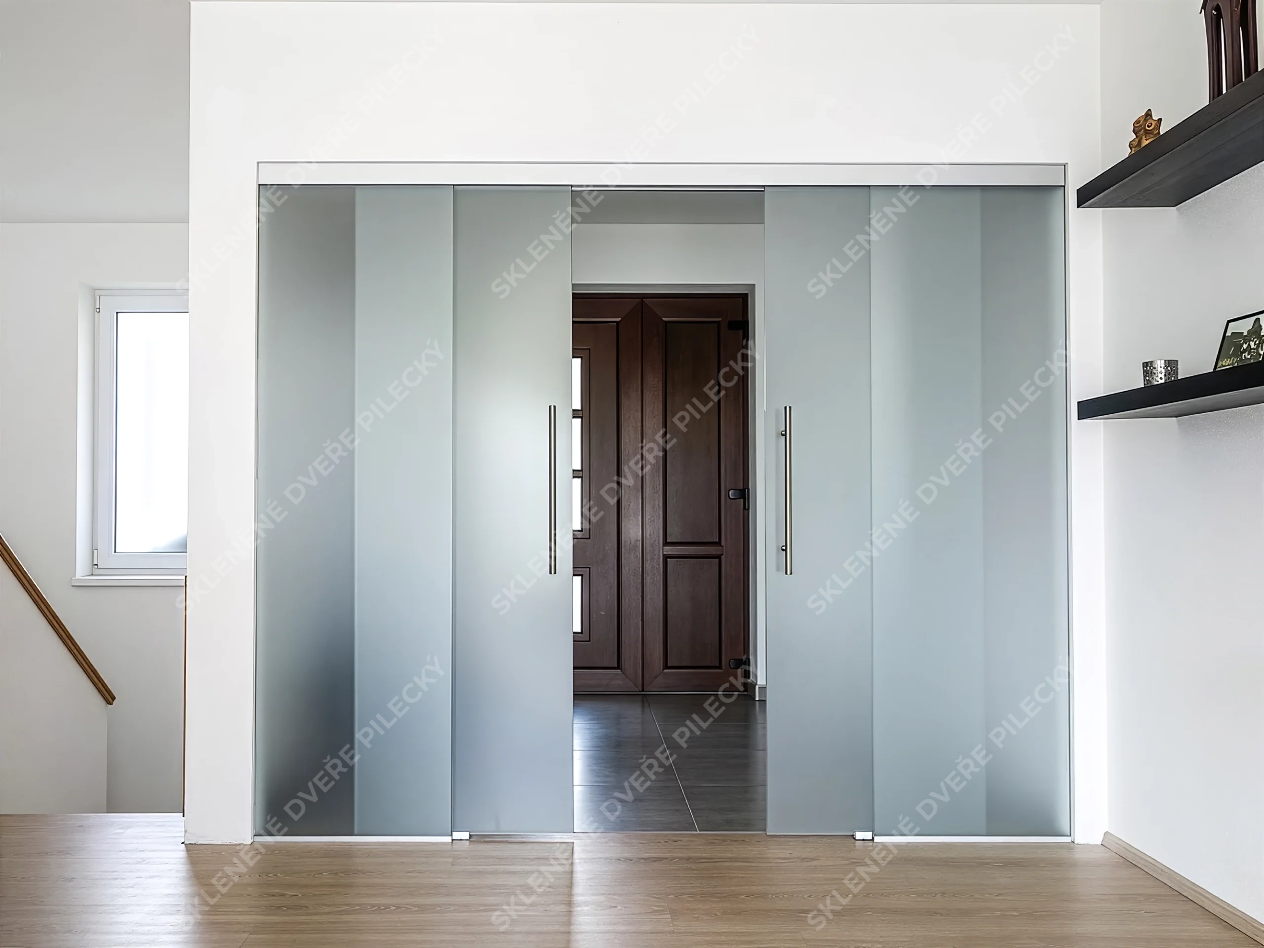 2. Skleněné posuvné dveře, dvě křídla. Sklo satináto či jiné provedení