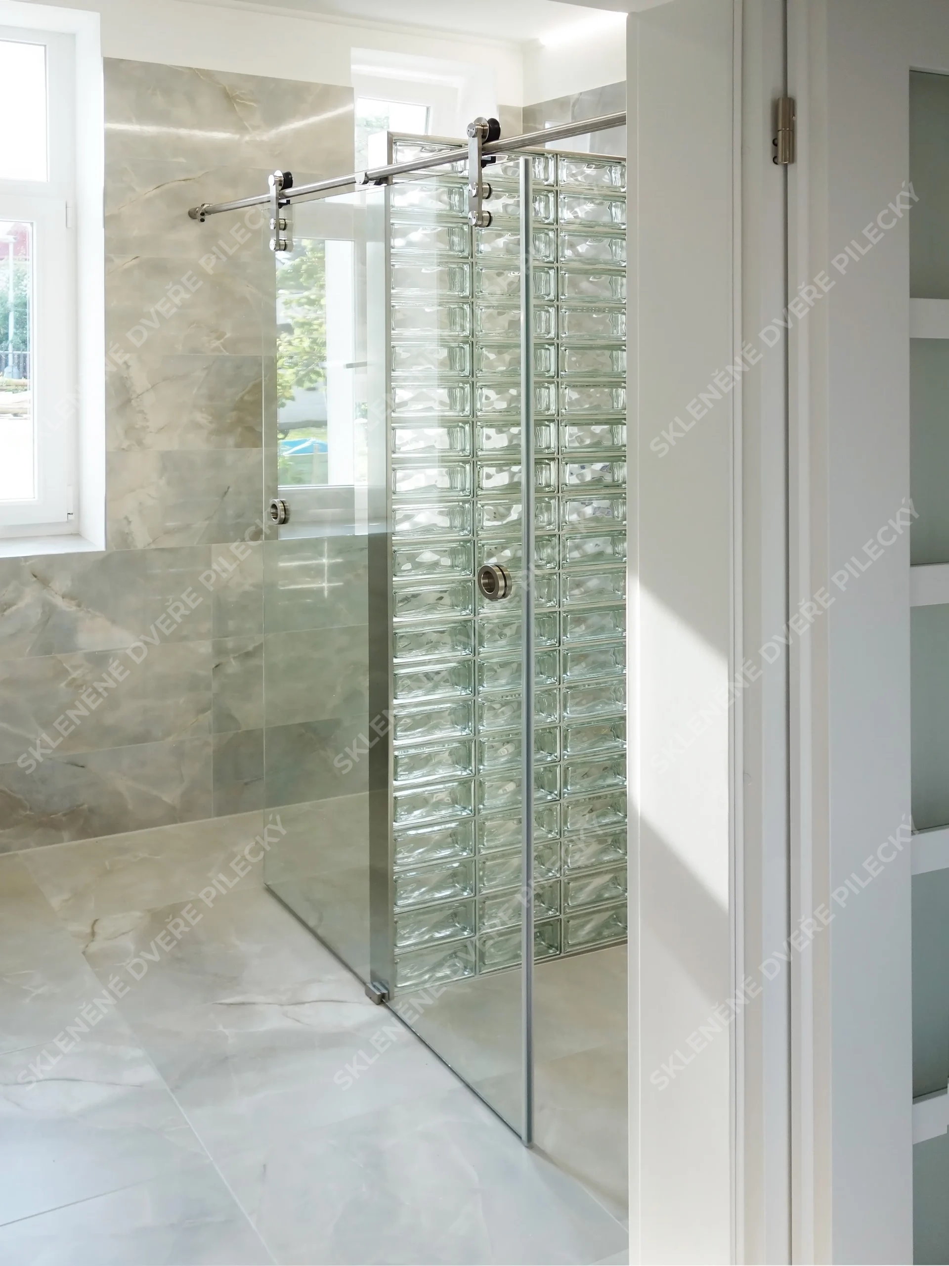 13. Skleněné posuvné dveře s kováním v bílém provedení.