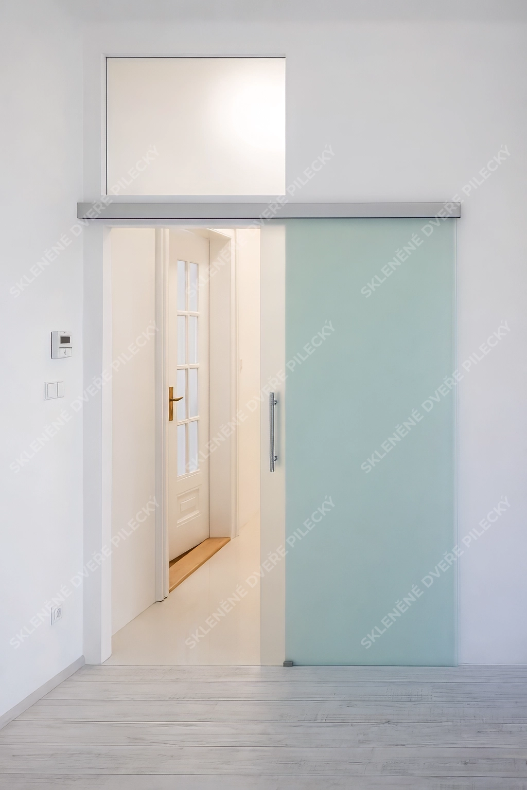 9. Skleněné posuvné dveře s pevným sklem. Sklo satináto či jiné provedení.